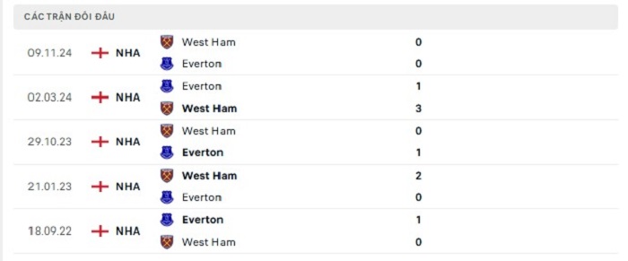 Lịch sử đối đầu của Everton vs West Ham