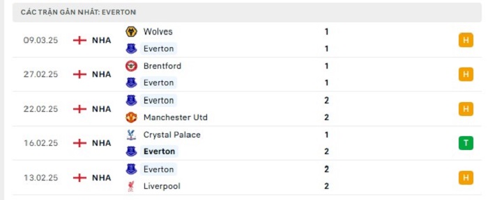 Phong độ gần đây Everton vs West Ham