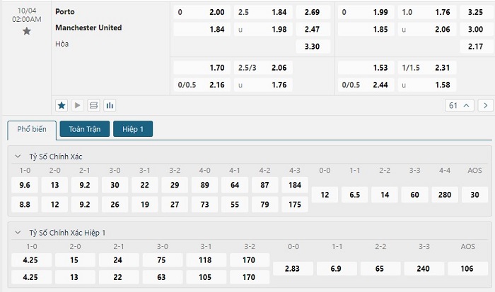 Mức kèo châu Á tại thời điểm hiện nay đang được niêm yết ở mốc đồng banh có thể thấy được sự cân bằng của hai đội. Nhưng dù vậy xét về mặt phong độ mà nói với FC Porto họ vẫn có được những kết quả khả quan hơn nhiều khi đang có được vị trí thứ 2 tại đấu trường quốc nội, trái ngược lại với Manchester United hiện nay họ đang thể hiện phong độ thi đấu bạc nhược với 3 trận đấu liên tiếp không biết tới mùi chiến thắng, do vậy mà khả năng thắng trận của FC Porto vẫn được đánh giá cao.