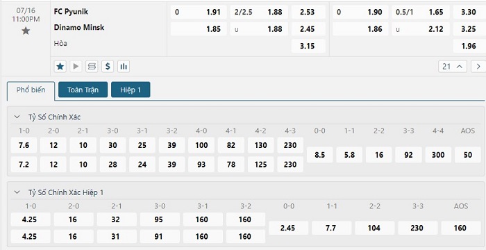 Bảng tỷ lệ kèo bóng đá trận đấu FC Pyunik vs Dinamo Minsk