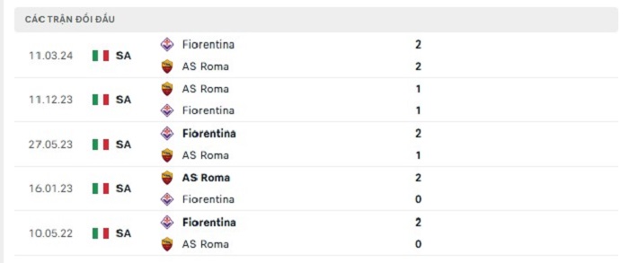 Lịch sử đối đầu của Fiorentina vs AS Roma