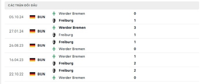 Lịch sử đối đầu của Freiburg vs Werder Bremen