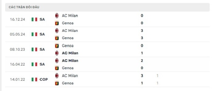 Thành tích trong quá khứ với Genoa họ cũng có không ít những khó khăn của mình trước AC Milan, tổng cộng 10 lần gặp nhau gần đây nhất giữa hai đội thì thành tích tốt nhất mà đội chủ nhà thu về được chỉ là 1 trận đấu thắng kèo châu Âu trong khi có tới 4 trận hoà cùng 5 thất bại đã phải nhận. Mùa này trong tổng số 15 vòng đấu có thành tích thắng kèo châu Âu thì với AC Milan có 8 trong số đó là thành tích đem về được trên sân khách, do vậy mà với thực lực hiện tại việc họ có một chiến thắng tiếp theo trước Genoa cũng không quá bất ngờ.