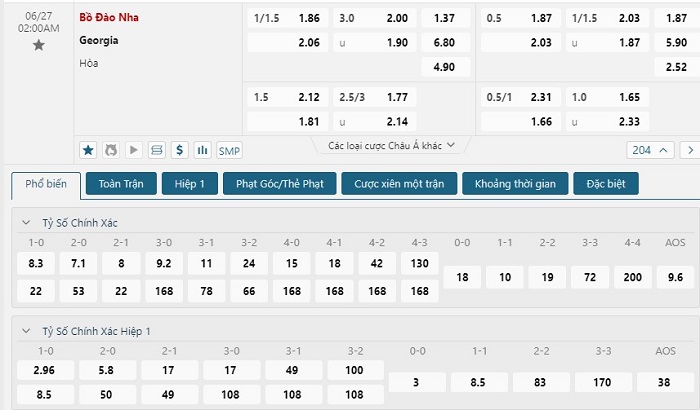 Bảng tỷ lệ kèo bóng đá trận đấu Georgia vs Bồ Đào Nha