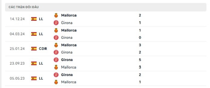 Lịch sử đối đầu của Girona vs Mallorca