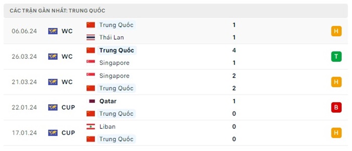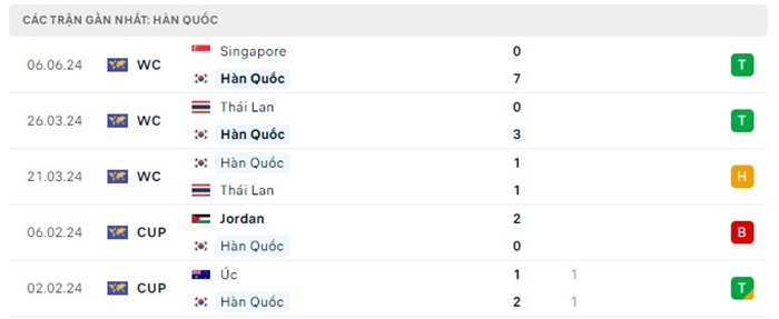 Phong độ gần đây Hàn Quốc vs Trung Quốc