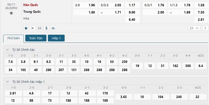 Bảng tỷ lệ kèo bóng đá trận đấu Hàn Quốc vs Trung Quốc