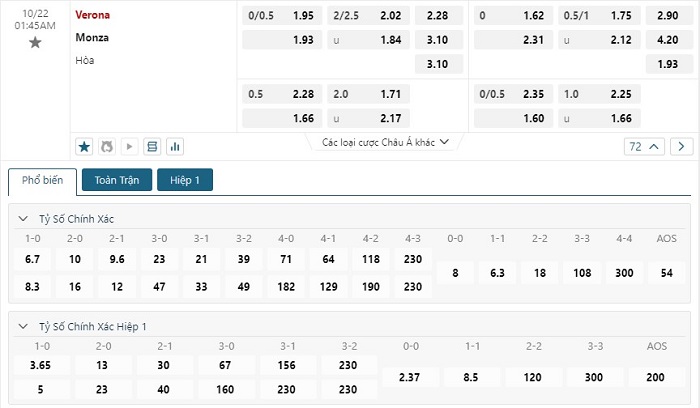 Mặc dù Monza không thể hiện được phong độ tốt nhưng chất lượng hàng thủ của họ cũng không phải là quá tệ, trong 2 trận gần đây nhất của Monza đều có tỷ lệ ghi bàn cũng từ 2 bàn thắng ghi được trở xuống. Hàng công của Hellas Verona hiện tại cũng không phải mạnh tại sân chơi Serie A này do vậy mà tỷ số trận đấu sắp tới giữa hai đội cũng sẽ khó có thể xuất hiện nhiều trong trận.