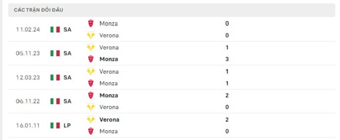 Lịch sử đối đầu của Hellas Verona vs Monza