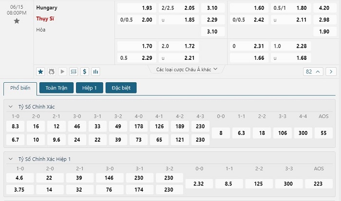 Bảng tỷ lệ kèo bóng đá trận đấu Hungary vs Thụy Sĩ