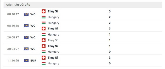 Lịch sử đối đầu của Hungary vs Thụy Sĩ