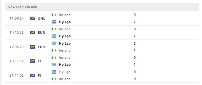 Lịch sử đối đầu của Hy Lạp vs Ireland