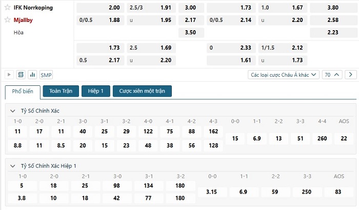 Bảng tỷ lệ kèo bóng đá trận đấu IFK Norrkoping vs Mjallby