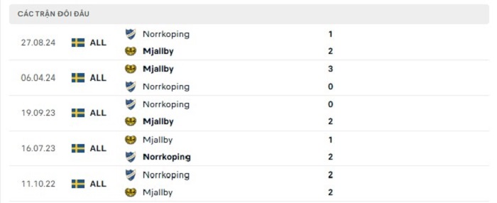 Lịch sử đối đầu của IFK Norrkoping vs Mjallby