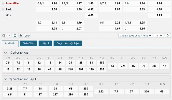 Bảng tỷ lệ kèo bóng đá trận đấu Inter Milan vs Lazio