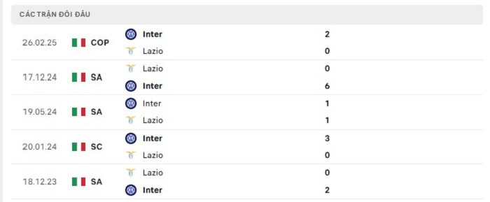 Lịch sử đối đầu của Inter Milan vs Lazio