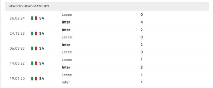 Lịch sử đối đầu của Inter Milan vs Lecce