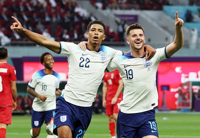 Anh: Pickford, Walker, Stones, Guehi, Trippier, Mainoo, Rice, Saka, Bellingham, Foden, Kane.