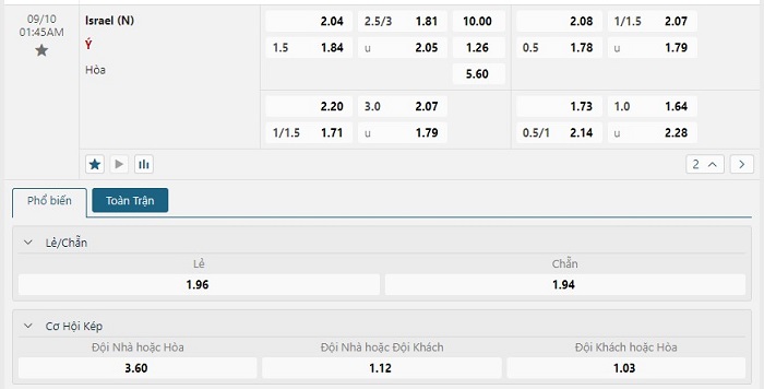 Bảng tỷ lệ kèo bóng đá trận đấu Israel vs Italia