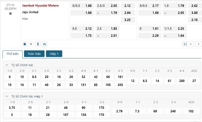 Bảng tỷ lệ kèo bóng đá trận đấu Jeonbuk vs Jeju United