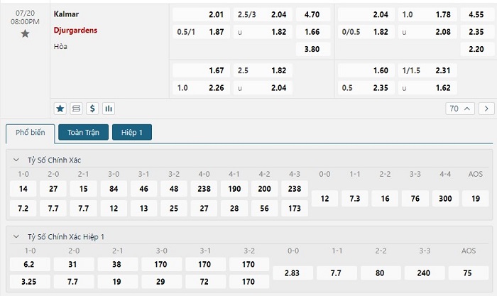 Bảng tỷ lệ kèo bóng đá trận đấu Kalmar vs Djurgardens