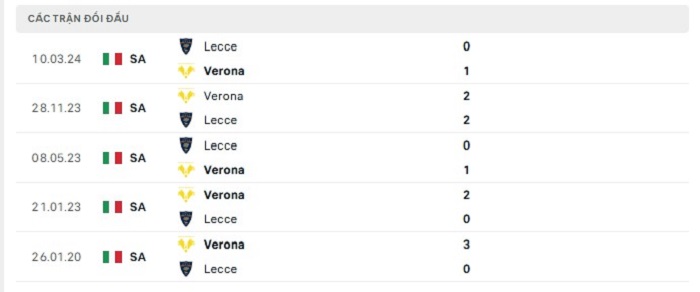Lịch sử đối đầu của Lecce vs Hellas Verona