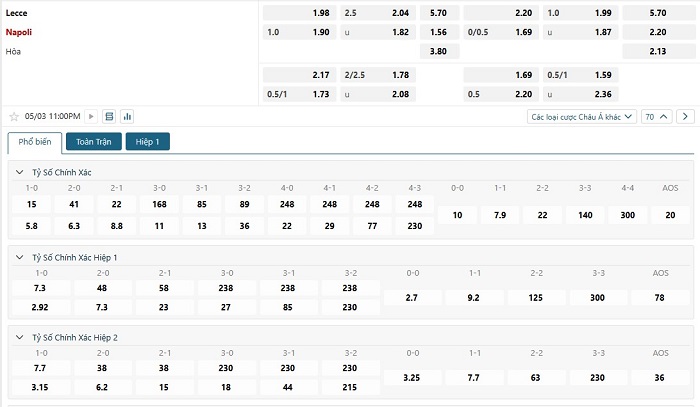 Bảng tỷ lệ kèo bóng đá trận đấu Lecce vs Napoli