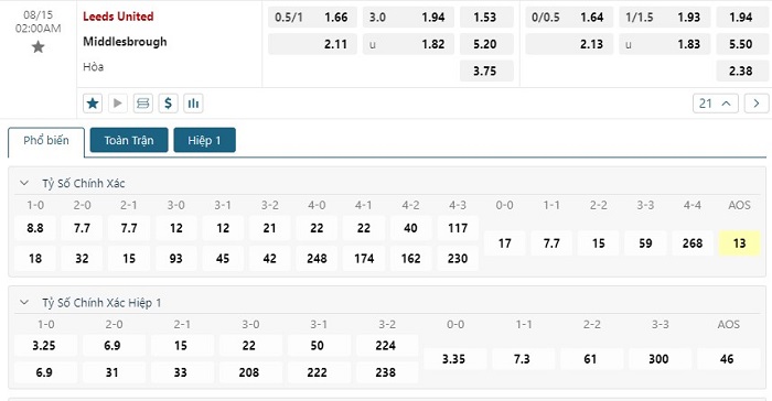 Bảng tỷ lệ kèo bóng đá trận đấu Leeds United vs Middlesbrough