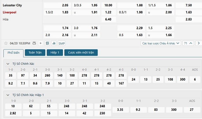 Bảng tỷ lệ kèo bóng đá trận đấu Leicester City vs Liverpool