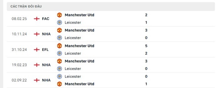 Lịch sử đối đầu của Leicester City vs Manchester United