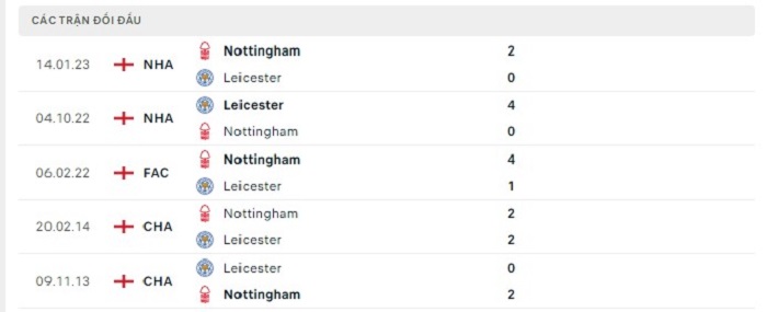 Lịch sử đối đầu của Leicester City vs Nottingham