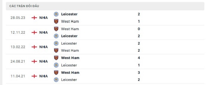 Lịch sử đối đầu của Leicester City vs West Ham United