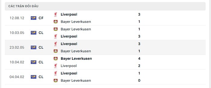 Lịch sử đối đầu của Liverpool vs Bayer Leverkusen
