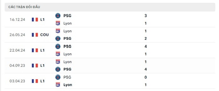 Lịch sử đối đầu của Lyon vs Paris Saint-Germain