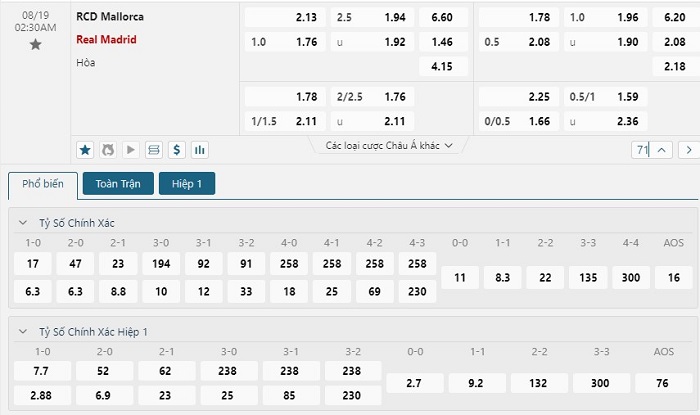 Bảng tỷ lệ kèo bóng đá trận đấu Mallorca vs Real Madrid