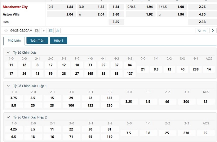 Bảng tỷ lệ kèo bóng đá trận đấu Manchester City vs Aston Villa