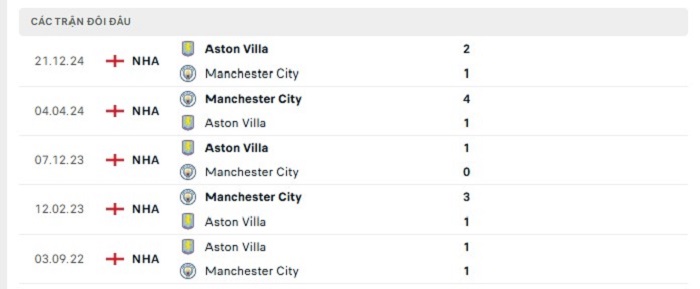 Lịch sử đối đầu của Manchester City vs Aston Villa
