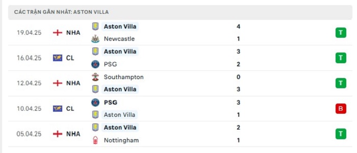 - Phong độ Aston Villa