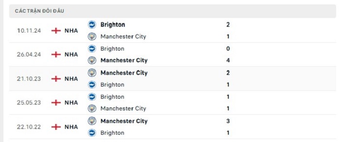 Bảng bóng đá trận đấu Manchester City vs Brighton