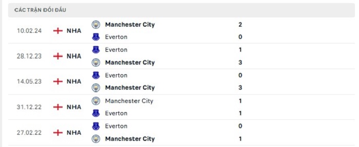 Lịch sử đối đầu của Manchester City vs Everton