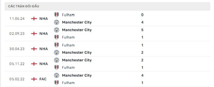 Lịch sử đối đầu của Manchester City vs Fulham