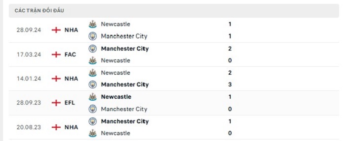 Lịch sử đối đầu của Manchester City vs Newcastle