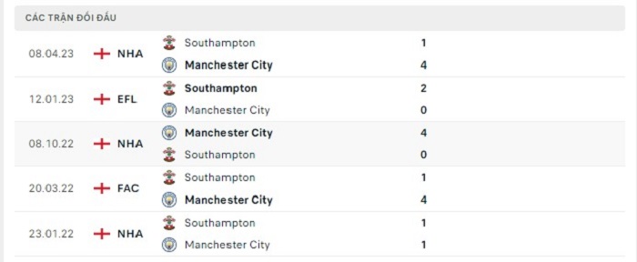 Bảng bóng đá trận đấu Manchester City vs Southampton