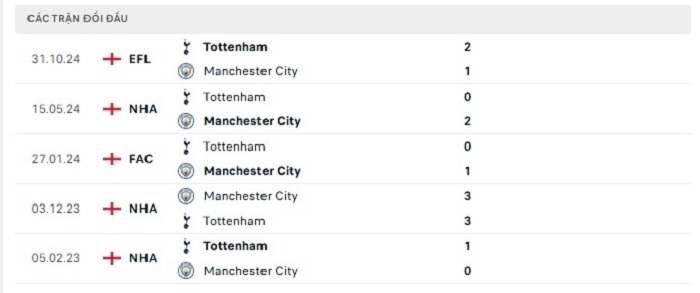 Lịch sử đối đầu của Manchester City vs Tottenham