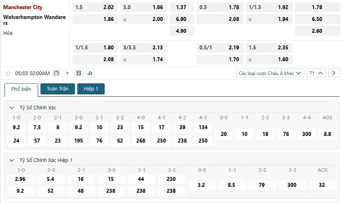 Bảng tỷ lệ kèo bóng đá trận đấu Manchester City vs Wolverhampton