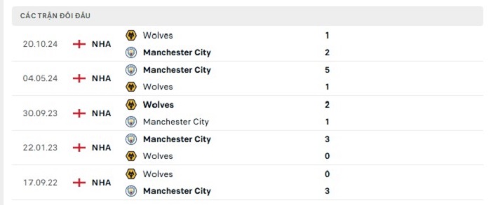Lịch sử đối đầu của Manchester City vs Wolverhampton