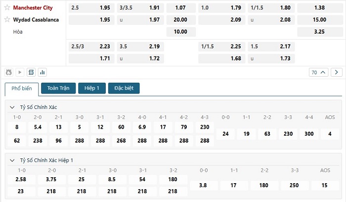Bảng tỷ lệ kèo bóng đá trận đấu Manchester City vs Wydad AC
