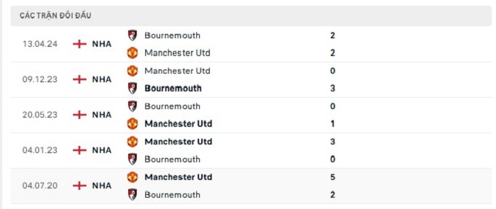Bảng  bóng đá trận đấu Manchester United vs Bournemouth