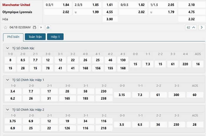 Bảng tỷ lệ kèo bóng đá trận đấu Manchester United vs Lyon