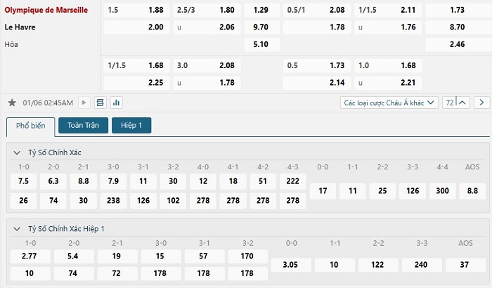 Quá khứ vẫn đang đứng về phía Marseille trong những lần gặp nhau giữa hai đội, thật vậy bởi đội chủ nhà đang có được thành tích bất bại trước Havre AC trong nhiều năm qua với 5 trận thắng kèo châu Âu và chỉ hoà 1 trong 6 lần gặp nhau gần nhất. Thực lực và phong độ của Marseille ở sân chơi Ligue 1 mùa này vẫn đang cho thấy được sự ổn định đáng kể của mình trái ngược hoàn toàn so với Harve AC đang thể hiện những mặt yếu kém, do vậy mà việc Marseille có được một chiến thắng theo kèo châu Âu là trong khả năng của họ.